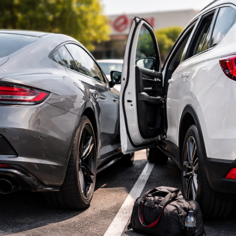 Parking areas outside gyms are often crowded, tight, and constantly active. People are moving quickly between workouts, carrying equipment, and loading bags into vehicles.