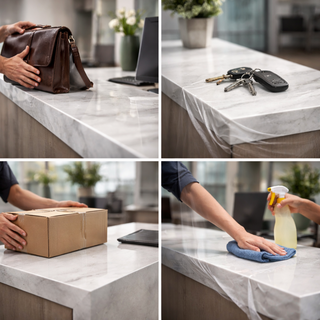 While reception counters benefit immediately, Paint Protection Film is equally effective across other interior surfaces, including: